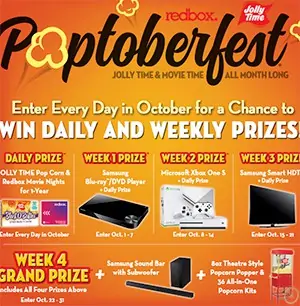 You can enter the Poptoberfest Giveaway from Jolly Time Popcorn for your chance to win daily and weekly prizes including Redbox Movie Nights for 1-year, a theater style Popcorn Popper, a Samsung Smart HDTV, an Xbox One S, Samsung Blu-Ray player and more. You can enter every day in October for a new chance to win! Entry ends October 31, 2018.