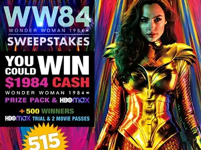 You can enter the WW84 Wonder Woman 1984 Sweepstakes from Big Bang Theory for your chance to be 1 of 15 grand prize winners of a $1,984 AMEX, 30-day HBO Max trial, and Wonder Woman 1984 prize pack. You’ll also have a chance to be 1 of 500 winners of an HBO Max trial and two tickets to Wonder Woman 1984. You can enter online by selecting the correct “word of the day” from weekday episodes of Big Bang Theory. Entry ends January 2, 2021.