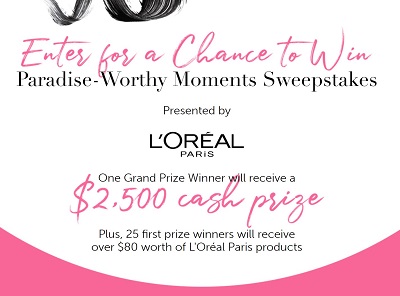 You can enter the Paradise-Worthy Moments Sweepstakes from L’Oreal Paris for your chance to win the grand prize of $2,500 cash awarded in the form of a check. You’ll also have a chance to be 1 of 25 first prize winners to receive over $80 worth of L’Oréal Paris products! Entry ends June 30, 2021.