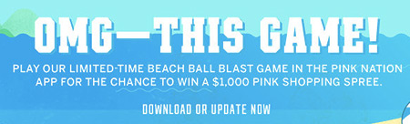 Download the Android version or iOS version Victoria’s Secret Pink Nation app to play the Beach Ball Blast game for a chance to win a $1,000 or a $100 Victoria’s Secret Pink shopping spree! Gain an entry each day you accrue at least ten thousand points playing the game.