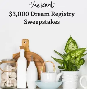 You can enter the $3,000 Dream Registry Sweepstakes from The Knot for your chance to win a $1,000 Crate & Barrel, $1,000 Wayfair, and $1,000 Williams-Sonoma gift card. Entry ends July 31, 2019.