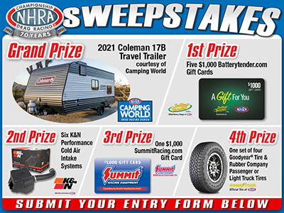 You can enter the 70th Anniversary Sweepstakes from NHRA for your chance to win the grand prize of a 2021 Coleman 17B Travel Trailer valued at $11,995. You’ll also have a chance to be the first prize winner of 1 of 5 $1,000 BatteryTender gift cards or 1 of 6 second prize winners of a K&N Performance cold air intake system. You’ll even have a chance to win a set of Goodyear tires or a $1K Summit Racing gift card. Entry ends December 17, 2021.