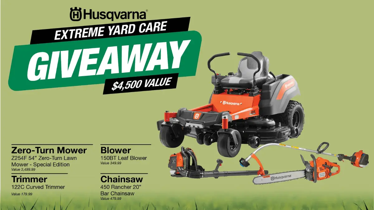 The Extreme Yard Care Husqvarna Giveaway is awarding one winner a Husqvarna yard care prize package worth approximately $4,509.96. The giveaway is sponsored by CSWW, Inc. and runs until March 31, 2025, at 11:59 p.m. EST.