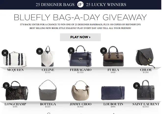 Enter the Bluefly Bag-A-Day Giveaway Instant Win Game for a chance to win 1 of 25 Designer Handbags from brands like Gucci, Prada, Balenciaga, and Valentino. Their giving away a bag per day through December 19th.