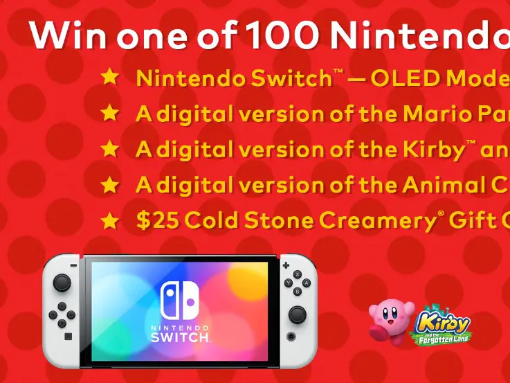 You can enter the Game System Sweepstakes from Cold Stone Creamery for your chance to win 1 of 100 Nintendo Switch Prize Packs! The packs include a Nintendo Switch OLED system, Mario Party Superstars, Kirby and the Forgotten Land, Animal Crossing: New Horizons, and a $25 Cold Stone Creamery gift card. Entry in the sweepstakes ends Friday, September 30, 2022 at 11:59 PM.