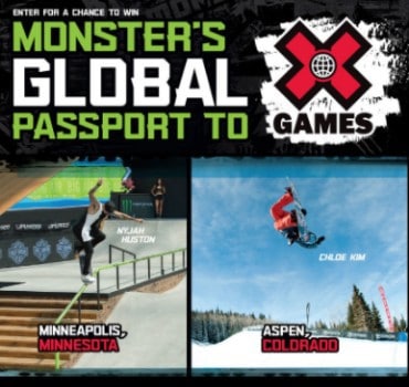 You can enter the Global Passport Sweepstakes from Monster Energy for your chance to be 1 of 10 winners of a VIP trip for two (2) to the X Games of your choice in Aspen, Minneapolis or Sydney. The trip includes airfare, 5-nights accommodations, tickets and $1,000 spending cash. You also have a chance to win 1 of 100 Monster Energy X Games skateboards or snowboards. Entry ends April 30, 2019.