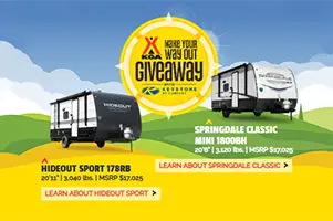 Get ready to hit the road in style with the Make Your Way Out Giveaway from KOA! Enter today for your chance to win your choice of a Keystone RV—the versatile Hideout Sport 178RB or the family-friendly Sprongdale Classic Mini 1800BH, both valued at over $17,000! As the grand prize winner, you’ll also receive a $500 KOA Gift Card to use towards your next adventure, along with $1,000 cash for additional travel expenses. Don’t miss out on this incredible opportunity to explore the great outdoors in comfort and convenience. Enter before the sweepstakes ends on May 31, 2024, at 11:59 p.m. MT!