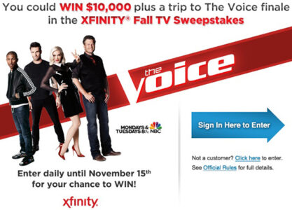 Enter for your chance to win the grand prize $10,000 plus a trip for two (2) to see The Voice finale in L.A. or a daily prize of a mini tablet in the XFINITY Fall TV Sweepstakes. Sweepstakes ends Novemeber 15, 2014.