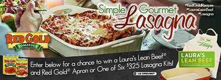 Enter for your chance to win a Le Creuset Signature Cast-Iron Rectangular Roaster in the Red Gold Lasagna Party Kit! The six grand prize packages also include a Laura’s Lean Beef & Red Gold Co-Branded Apron, one Red Gold spatula, one Garfield plush toy, and all the ingredients to make the Red Gold “Simple Gourmet…