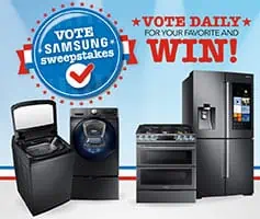 Don’t miss your chance to be one of four winnners of a Samsung appliance from HHGregg in the Vote Samsung Sweepstakes. You can win the appliance you vote for – a refrigerator, steam washer, electric range or top-load washer. Entry ends July 16, 2016.
