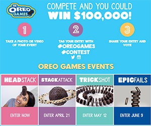 You can play the Walmart Oreo Games from Mondelez Global for your chance to win the $100,000 check grand prize, one of three $5,000 check finalist prizes, a runner-up check of $10,000, one of thirty $500 gift cards or one of fifty $50 gift cards. Entry ends July 06, 2017.