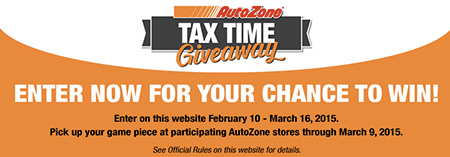 The AutoZone Tax Time Giveaway Instant Win Game is giving you a chance to win 16 Grand Prizes valued at a total of $4,000 each and 4,000 $10 AutoZone Gift Cards! All entrants receive a $5 coupon just for playing! Each of the Grand Prize winners will receive a $2,500 check, plus a $1,500 check to defray their 2015 tax liability.