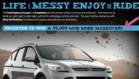 Enter the Ford Mud Mode Makeover Sweepstakes for the chance to win $5,000 to enjoy a makeover your way! Get styled at a new salon, relax at a stylish spa or shop-till-you-drop at your favorite stores… the choice is yours!