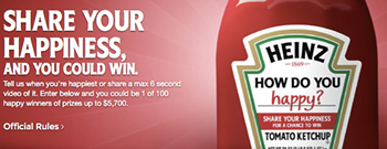 Share what makes you the happiest for a chance to win prizes up to $5,700, or one of the $108 prizes in the Heinz Ketchup How Do You Happy Sweepstakes and Contest!
