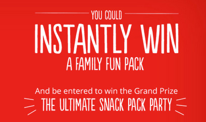 Play daily for your chance to #win a Camping Fun Pack, Road Trip Fun Pack, Game Night Fun Pack, Sports Fun Pack, or a Movie Night Fun Pack in the Snack Pack Have a Spoonful Instant Win Game . Plus, one lucky winner will receive a $10,000 Ultimate Snack Pack party!