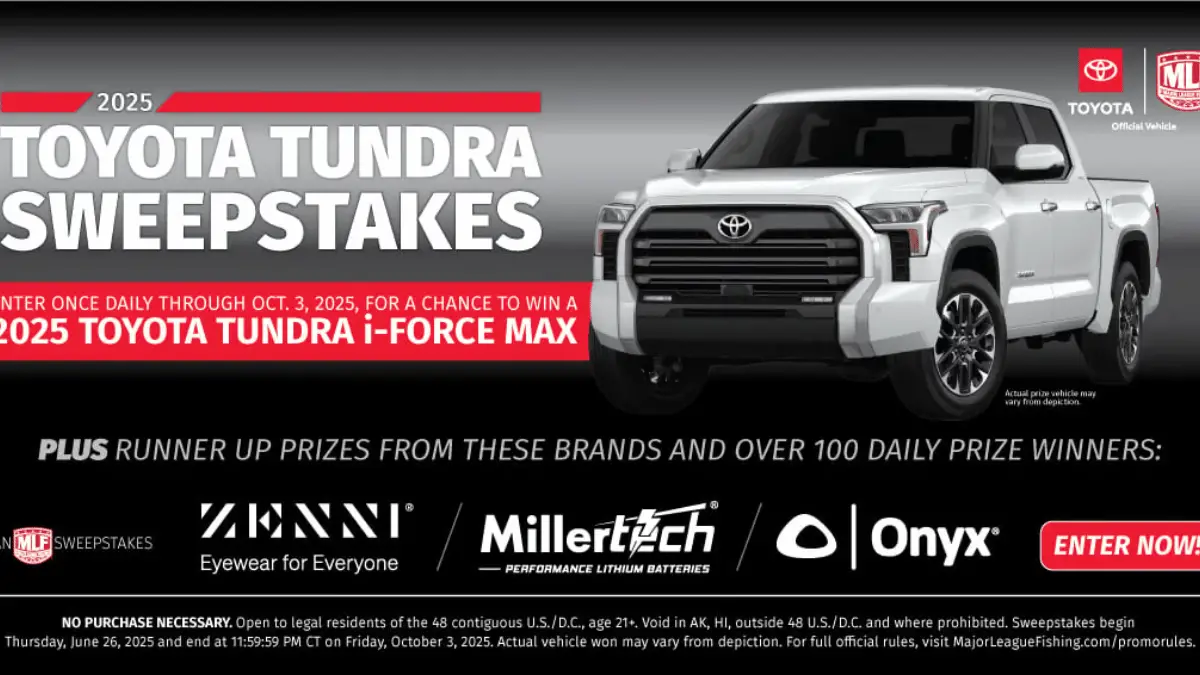 The grand prize for this sweepstakes is a 2025 Toyota Tundra truck valued at an approximate retail price of $61,635. Additionally, two first prizes consisting of MillerTech battery packages, one second prize of an Onyx Outfit Your Boat package, and ten third prizes featuring Zenni Eyewear packages will also be awarded.