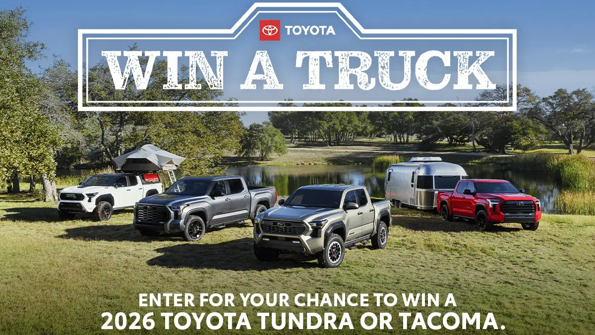 The Toyota Truck Giveaway Sweepstakes allows residents of Texas, Oklahoma, Arkansas, Mississippi, and Louisiana aged 18 and older a chance to win an impressive prize. Running from April 1, 2025, through March 31, 2026, one lucky winner will get to choose between a 2026 Toyota Tundra or Tacoma (gas or hybrid) valued up to $70,000. Interested participants can enter online at ToyotaTruckGiveaway.com.
