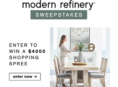 You can enter the Modern Refinery Sweepstakes from Ashely Furniture for your chance to win a $4,000 Ashley Homestore shopping spree! If you are the big winner you can load up on goods to transform your space like furniture, bedding, bath items, kitchen appliances, outdoor decor and so much more. Entry ends July 15, 2021.