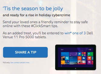 Send your loved ones a friendly reminder to stay safe online with Intel’s #ClickSmart tips and you’ll be entered to win one of 3 Dell Venue 11 Pro 5000 tablets. With all the online shopping this time of year, it’s more important than ever to trust the websites you visit.