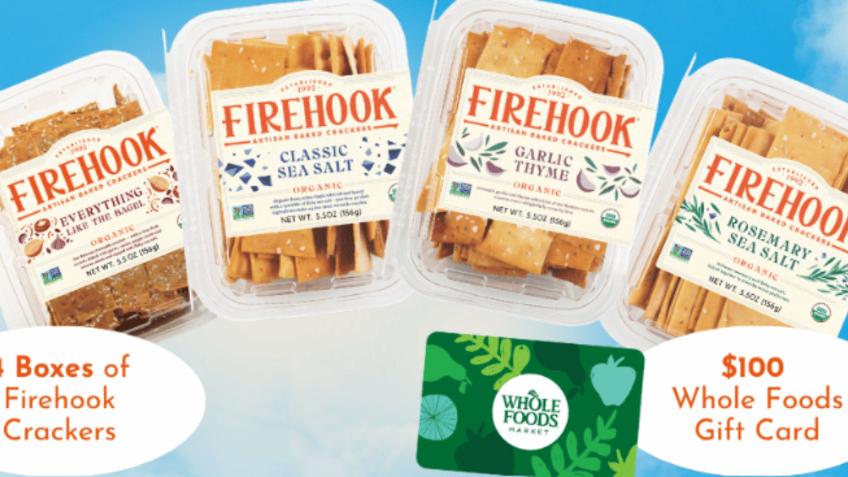 The prize includes a Firehook Crackers package and a $100 Whole Foods gift card, subject to standard terms and conditions. Odds of winning depend on the number of entries received.