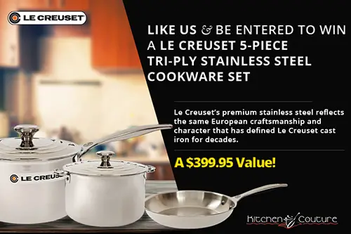 Enter for your chance to win a Le Creuset 5-Piece Tri-Ply Stainless Steel Cookware Set featuring Tri-ply construction, ergonomic stay-cool handles and stainless steel knobs from Kitchen Couture.