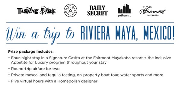 Tasting Table is offering you a chance to win a trip to Riviera Maya, Mexico for two that includes a 4-night stay at the Fairmont Mayakoba resort, airfare, tequilla tasting, boat tour and more.