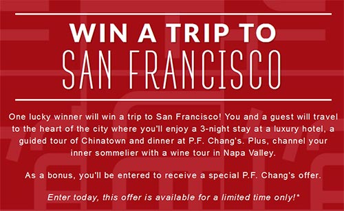 P.F. Chang’s is giving away a trip for two to San Francisco to enjoy a 3-night stay at a luxury hotel, a guided tour of Chinatown and dinner at P.F. Chang’s – plus you’ll get a wine tour of Napa.