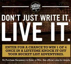 You can enter the Knock It Off Your Bucket List Sweepstakes from Old Smoky Moonshine for your chance to win your choice of a Bucket List Adventure. The choices include a SEAL training experience in Virginia, VIP tickets to a race in Bristol, Tennessee, tickets to a post-season college football game and a 3-night stay at Jake Peavy’s Southern Falls Plantation in Catherine, Alabama to hunt, fish, swim, bowl and more. Entry ends November 30, 2016.