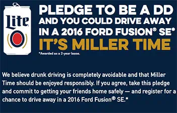 You can enter the 2016 Designated Driver Sweepstakes from Miller Lite for your chance to win a 2-year lease on a 2016 Ford Fusion SE when you take a pledge to be a DD and commit to getting your friends home safely. Entry ends November 01, 2016.