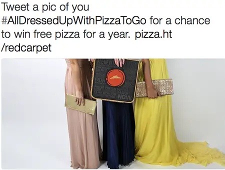 Tweet a pic of you #AllDressedUpWithPizzaToGo for a chance to win free pizza for a year, in the Pizza Hut #ALLDRESSEDUPWITHPIZZATOGO Sweepstakes!