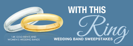 Enter for your chance to win his & hers wedding bands, a 14K men’s size 10 white or yellow gold wedding band and a 14K women’s size 7 white or yellow gold wedding band. (Retail for Men’s Band $999; Women’s Band $699)