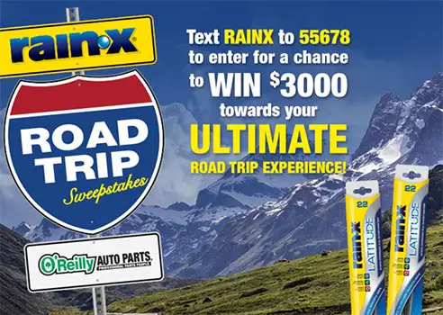 Rain X and O’Reilly are offering you a chance to win $3,000 towards your ultimate road trip experience when you text RAINX to 55678 in their Road Trip Text to Win Sweeps.