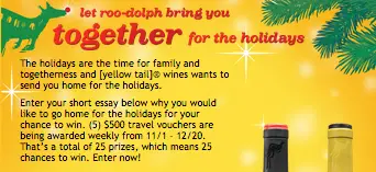 Yellow Tail wines wants to help you get home for the holidays. Enter a short essay about why you would like to go home for the holidays for your chance to win one of 25 travel vouchers worth $500 each. They’ll be giving away 5 of these each week through 12/20!